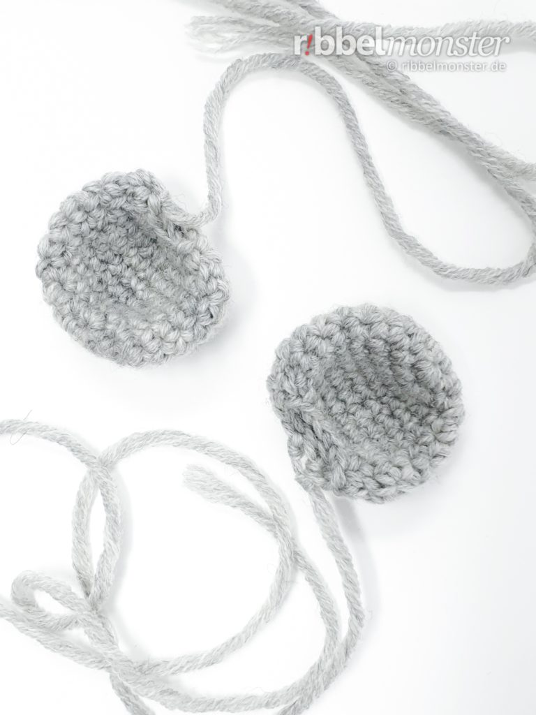 Anschließend werden die Ohren flach gefaltet und mit den Fadenenden mit der Öffnung an den Kopf genäht. Sie sitzen in einer Linie parallel zu den Augen auf der Oberseite des Kopfes. Dabei beginnen sie nach der 8. Runde und enden nach der 12. Runde. Wenn die Ohren fertig angenäht sind, werden die Fadenenden im Inneren des Kopfes gesichert.